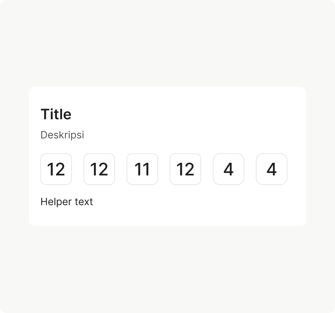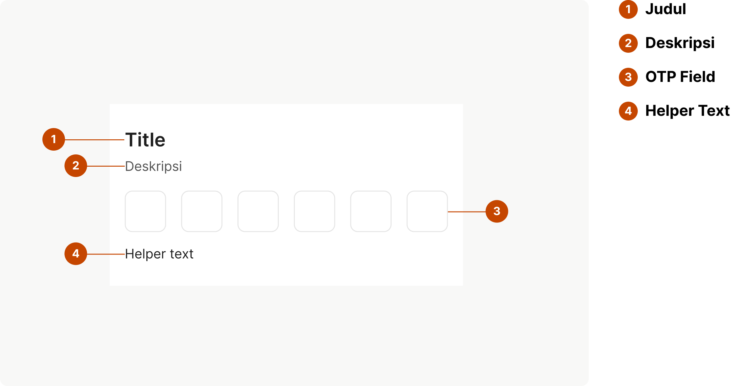 Gunakan helper text hanya untuk instruksi atau koreksi penting. Jangan menampilkan teks yang terlalu panjang atau berulang, pastikan fokus pada konteks, misalnya: "Kode OTP terdiri dari 6 digit angka."