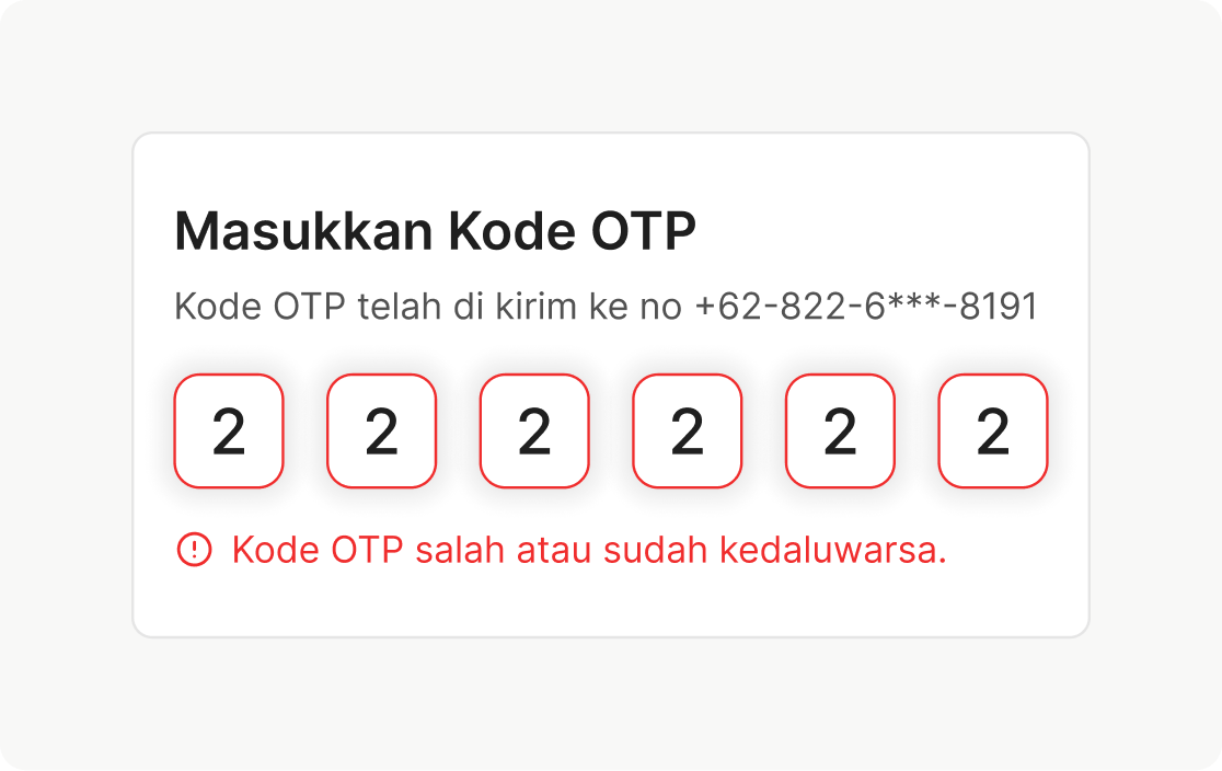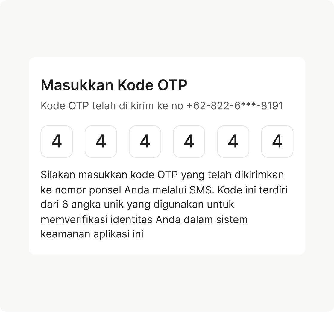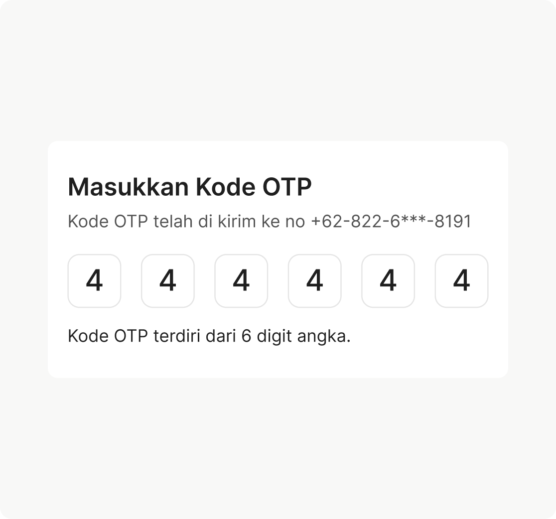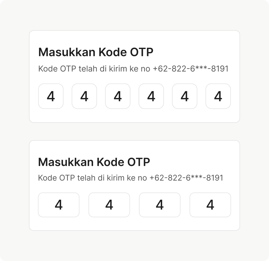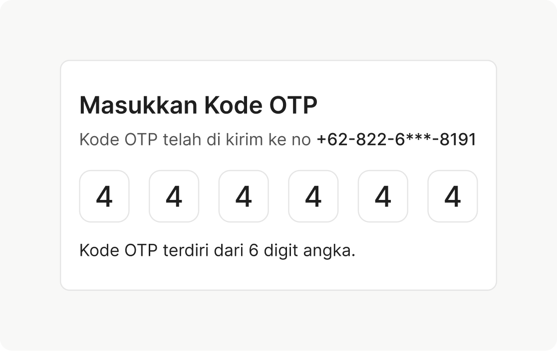 Section titled “Penggunaan”Gunakan OTP saat pengguna perlu melakukan autentikasi tambahan tanpa harus memasukkan kata sandi berulang kali. Komponen ini umum diterapkan pada alur verifikasi nomor ponsel, transaksi keuangan, atau reset kata sandi untuk menjaga keamanan dan keandalan sistem.